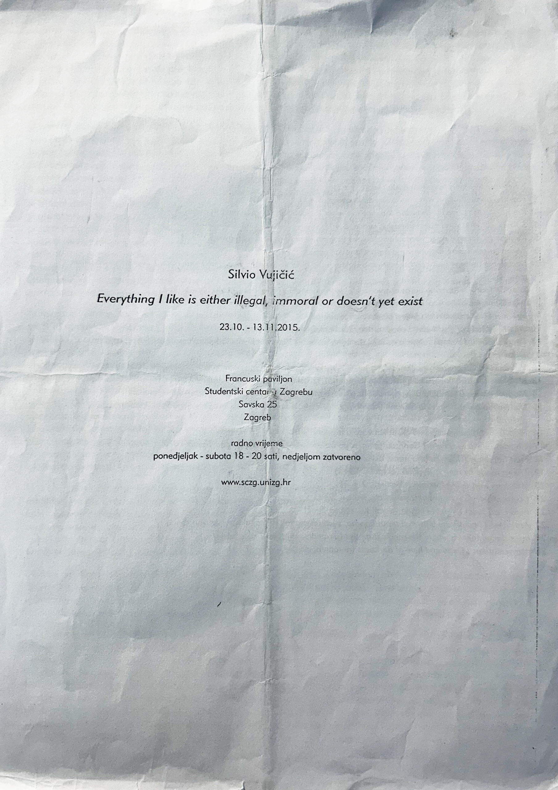 Kiš, M., Silvio Vujičić: Everything I Like Is Either Illegal, Immoral, or Doesn’t Yet Exist, exhibition catalogue, French Pavilion, Student Centre Zagreb, Zagreb, 2015