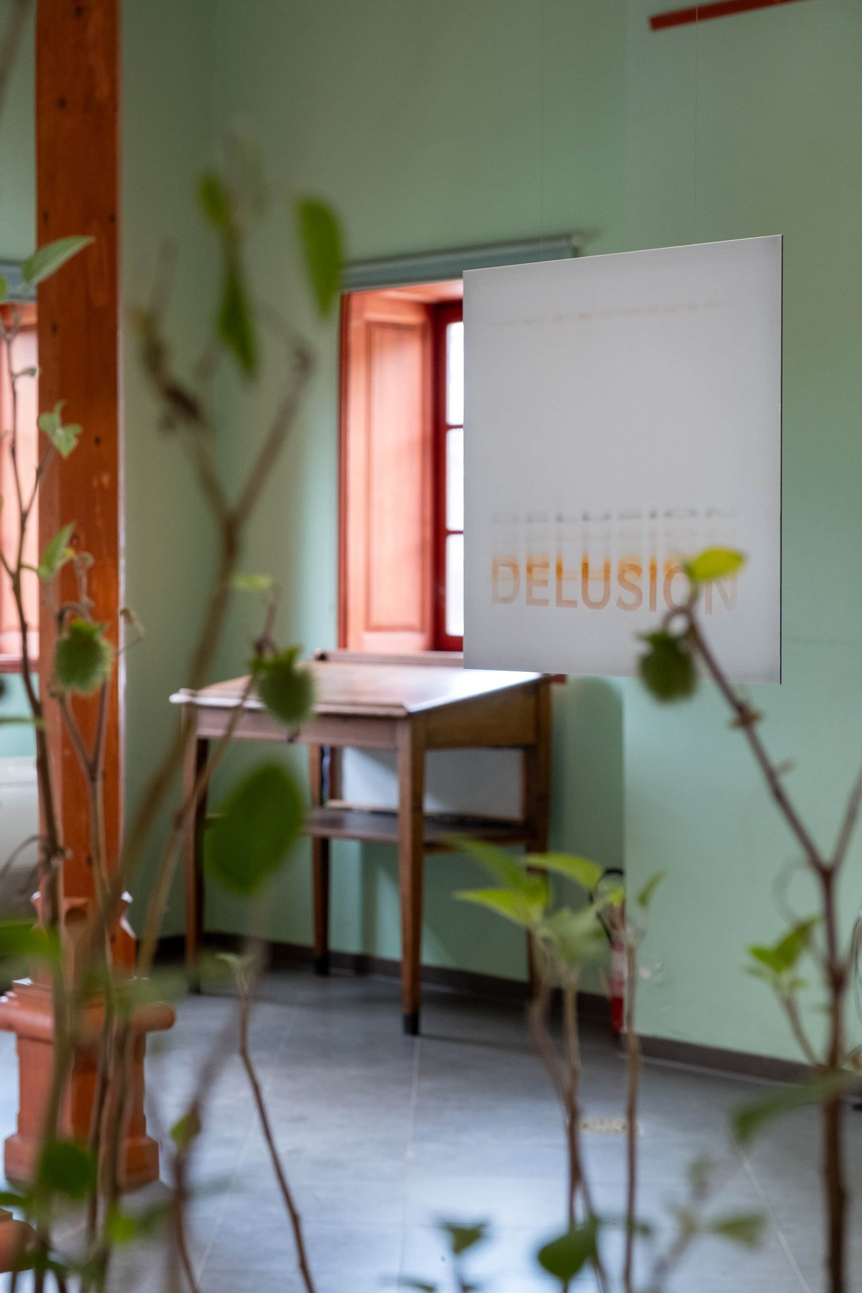 Digital prints on Hahnemühle Photo Rag Baryta, mounted on Dibond with U-profile strip frames; white floor installation with table, Datura plants in containers, and video monitor