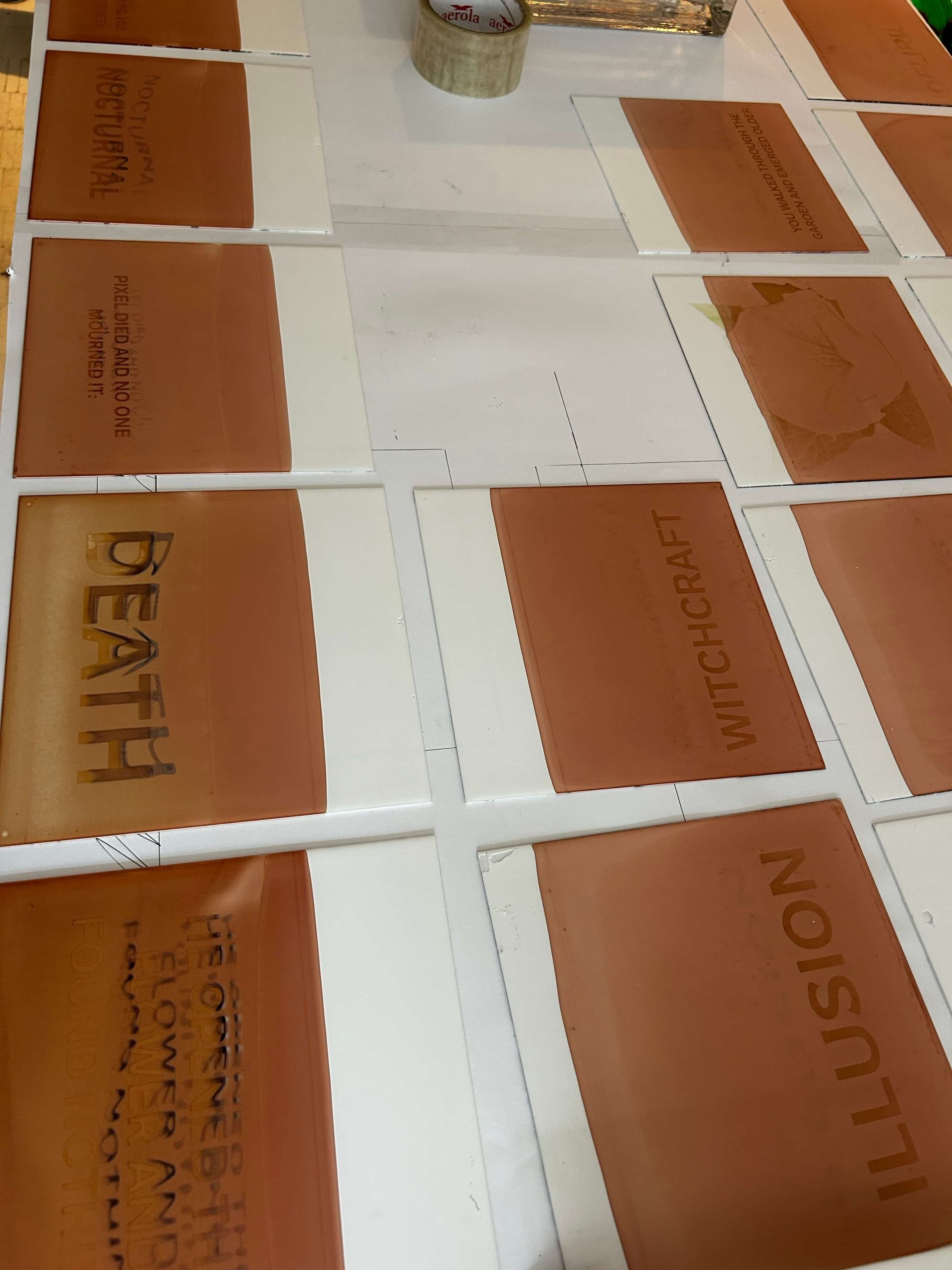 Nocturno is an installation shaped through a multi-stage experimental process in which chemistry, botany, and alchemy converge. At its core is the Datura — a night-blooming plant of ambivalent nature, both medicinal and poisonous, sacred and fatal. Its alkaloids, extracted and transferred through screen printing onto chromatographic plates, perform their own ritual: separating, evaporating, and revealing fleeting words such as Death, Ceremony, Delirium, Delusion, and Witchcraft.